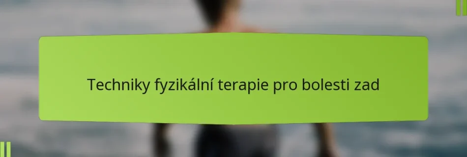 Techniky fyzioterapie pro úlevu od bolesti zad často zahrnují cvičení navržená k posílení zad a zlepšení flexibility. Terapeuti mohou používat manuální terapii, protahování a specifická posilovací cvičení přizpůsobená stavu pacienta. Pravidelné sezení mohou vést k významnému zlepšení úrovně bolesti a funkční schopnosti.